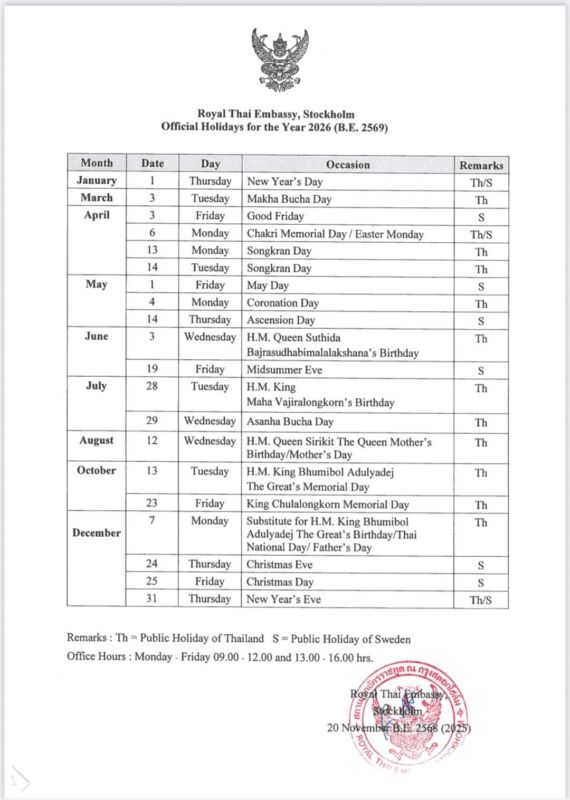 För frågor avseende visum samt legaliseringar hänvisas till Thailändska ambassaden i Stockholm.